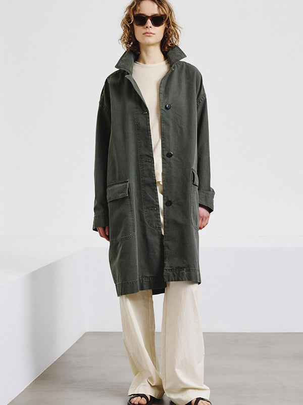 A casual look and contemporary attitude define the cotton panama coat. The “old-effect” dyeing process applied to the cotton fabric gives the shade a slightly uneven appearance and creates subtle variations along the seams and edges of the garment. The design features valuable style details that are also functional, enhancing the versatile appeal of the piece. Fully unlined, it is an ideal garment for the spring season.