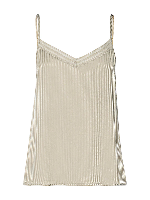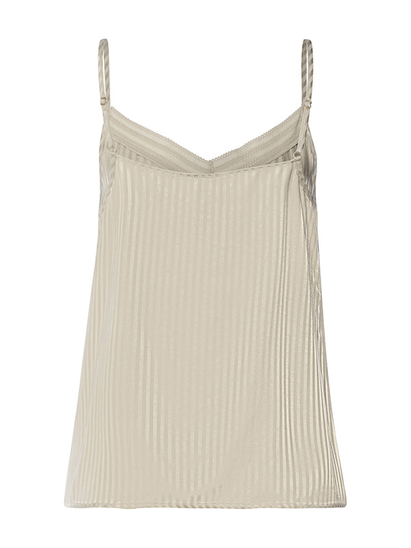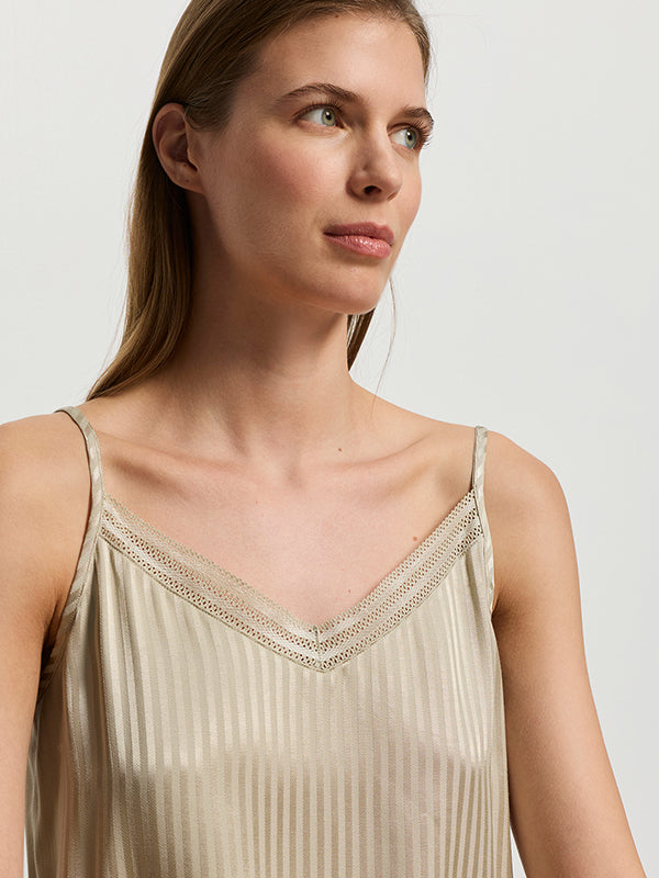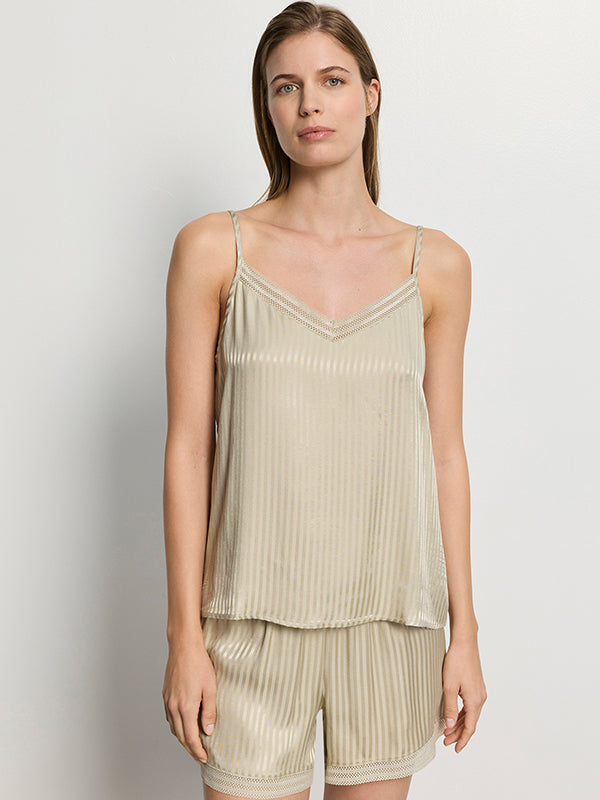 This loose spaghetti top made of 100% soft viscose is lightweight and delicate. An elastic tulle ribbon in a lace look adorns the V-shaped neckline at the front. Matte and shiny jacquard stripes give the sleeveless top an understated charm. The woven fabric is ideal as pyjamas and dayjama tops as well as relaxed travel wear. Hybrid underwear pieces like these are worth their weight in gold, especially on holiday.