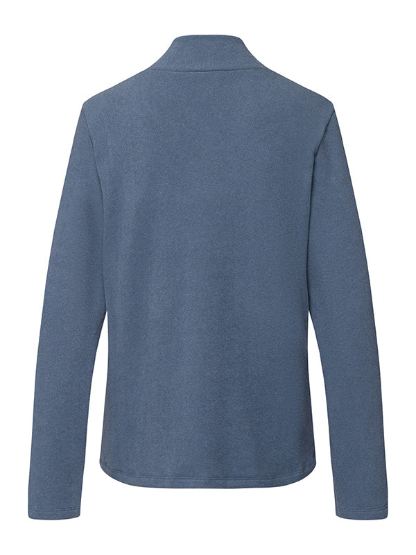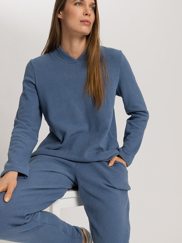 Recycled cotton with GRS certification makes up the main part of this warming fabric blend with a knitted look. The special soft, pull-on collar attached on the inside of the brushed jumper fits elegantly around the wearer's neck. Cut in a slight A-line, this sustainable loungewear impresses with its comfortable fit. The jumper can be perfectly combined with the long trousers in the same design on cold days as a cosy feel-good set for wearing at home or a casual travel outfit for when you're on the go!