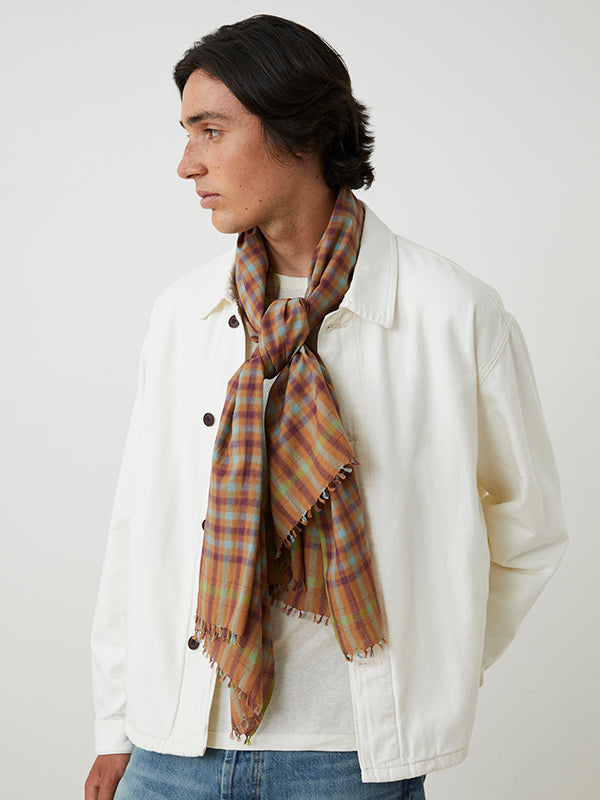 The Rossignol N°769 scarf highlights the fusion of our inspirations, from Picardy to India, through a gingham check pattern. Made from lightweight, natural cotton, it is handwoven with a space-dye yarn that combines two colors on a single thread, creating shades reminiscent of the ikkat effect. The clean edges with a contrasting stitched pleat and the fringed ends provide a refined finish, while the embroidered "M" elegantly completes the piece.