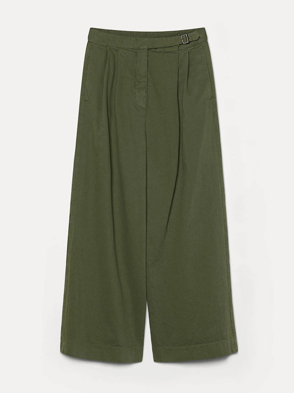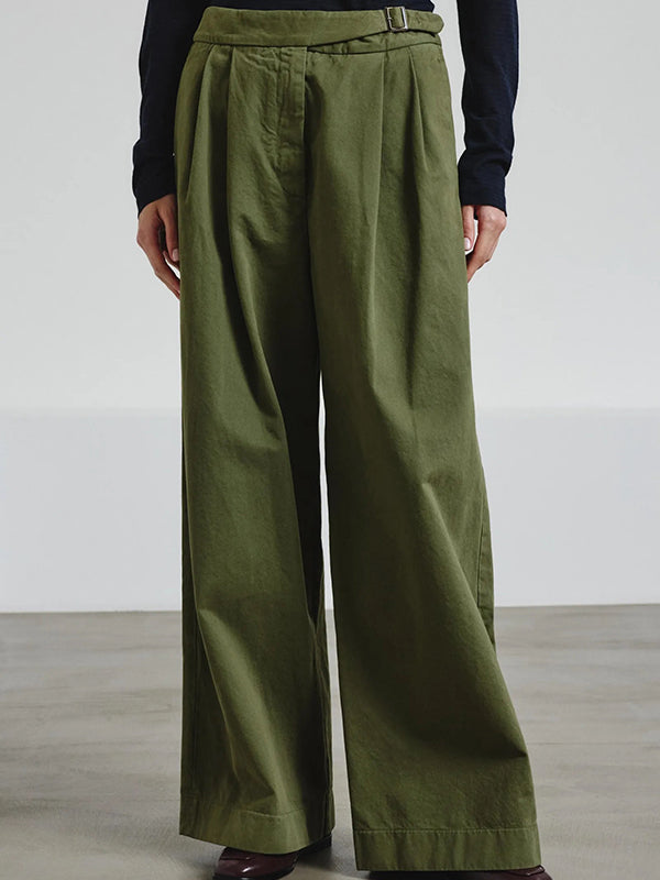 The casual appeal of the cotton drill trousers is enriched with tailored details. The model features a silhouette that develops wide along the leg, striking a perfect balance between comfort and style. The drawstring belt defines the waist and adds a functional element, while the double pleat, inspired by masculine elegance, gives the trousers a clean and impeccable look.